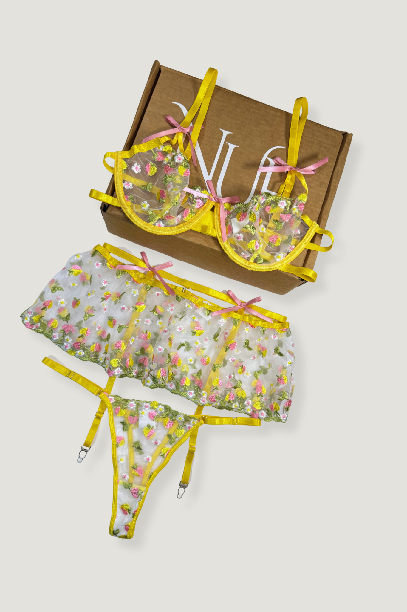 Luce sofisticada y alegre con el “Amber”, un conjunto de tres piezas amarillo con estampado floral que transmite frescura, delicadeza y un toque romántico en cada detalle.