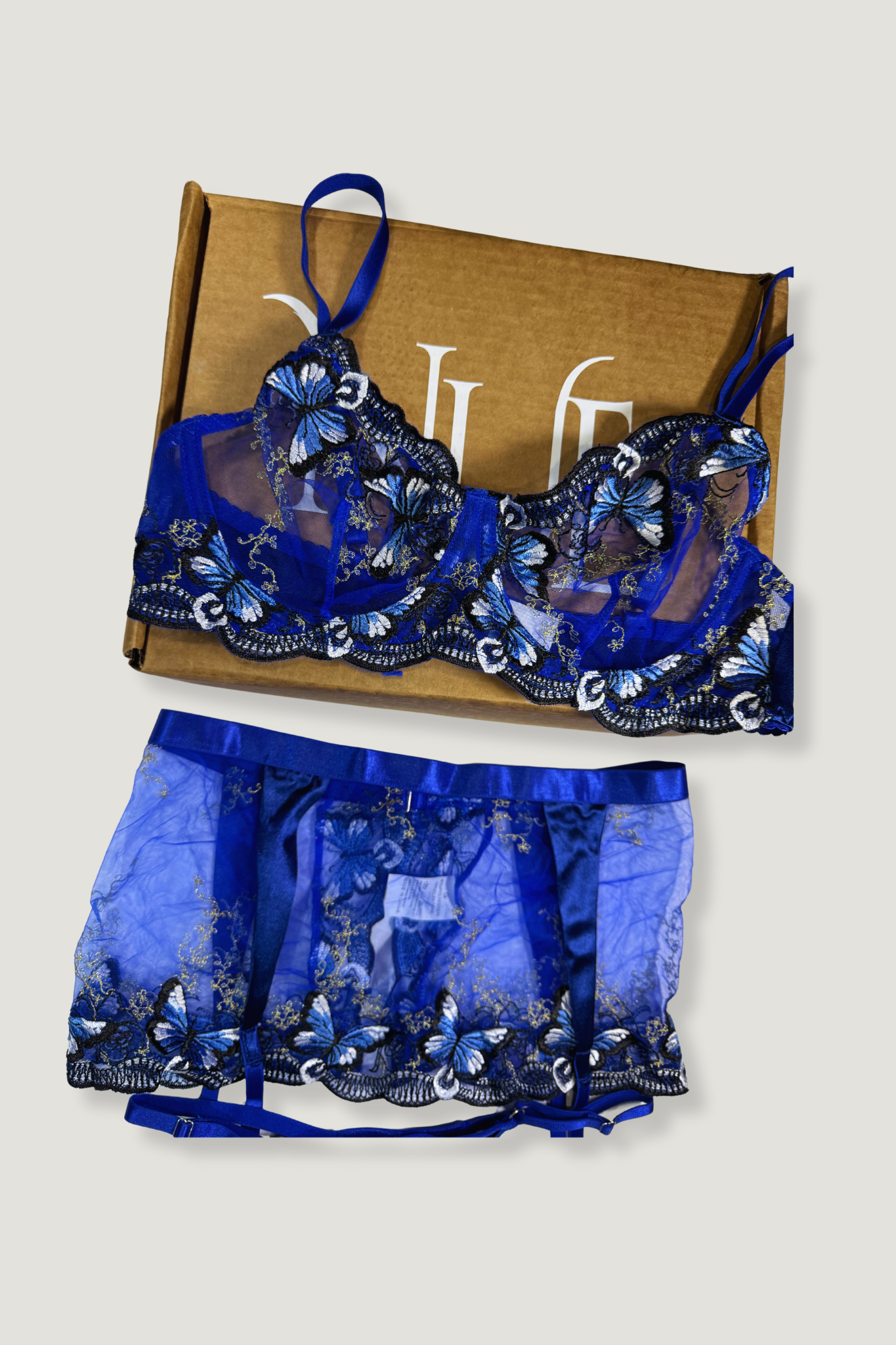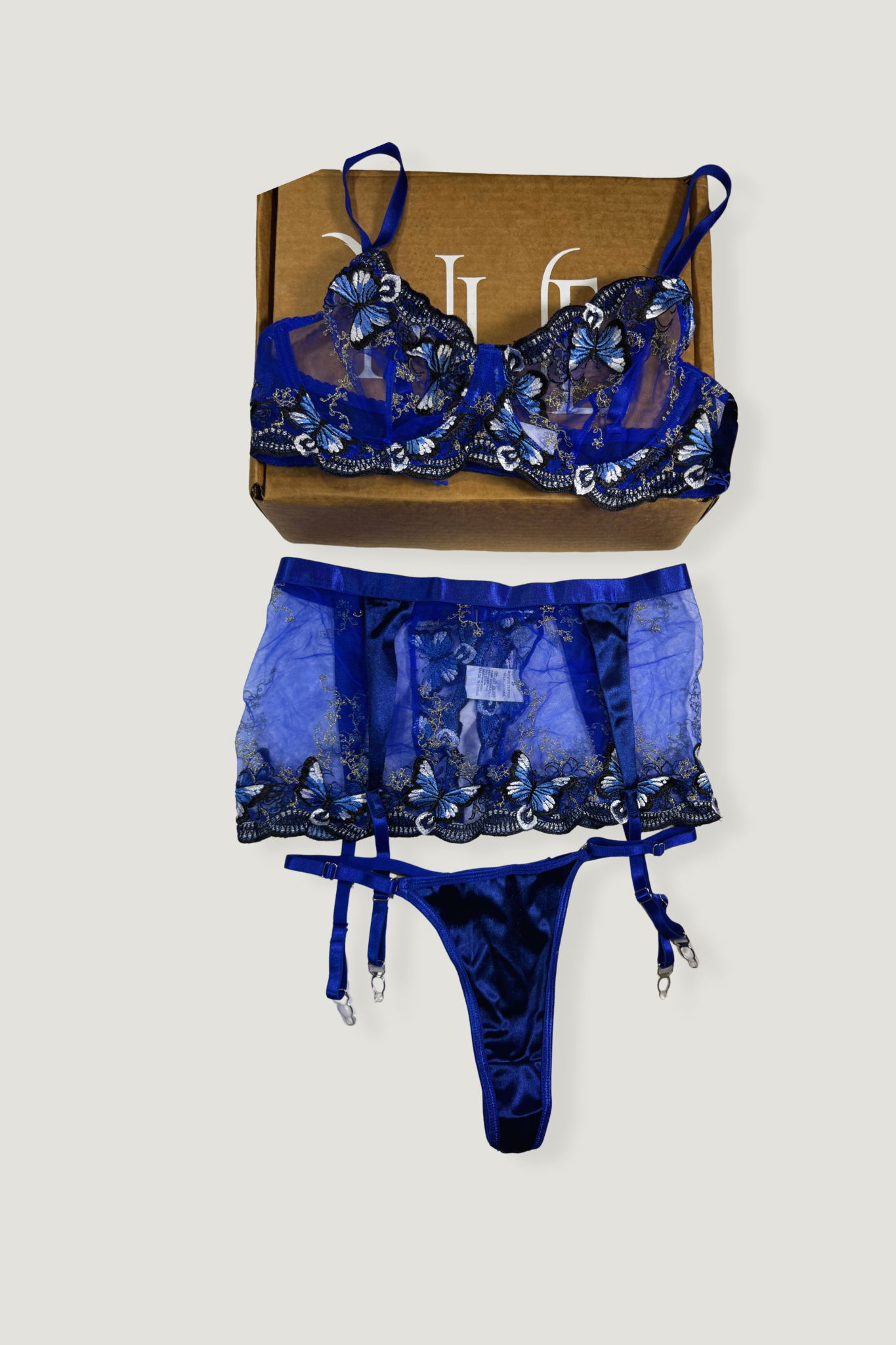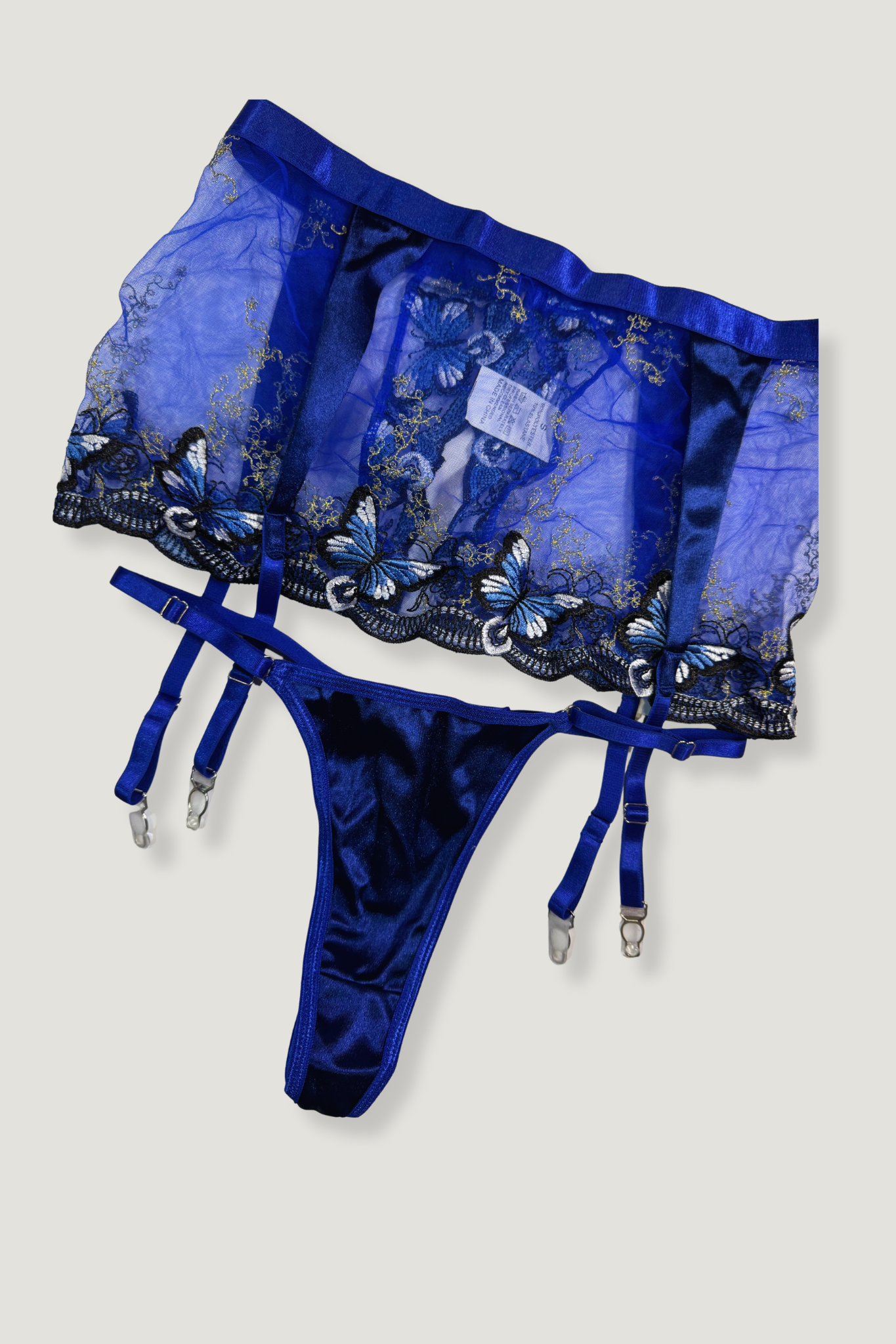 Descubre la elegancia del “Azure Bloom”, un conjunto de tres piezas en azul clásico tipo satín. Incluye sujetador, liguero y panty a juego, diseñado para realzar tu figura con sensualidad y estilo refinado.