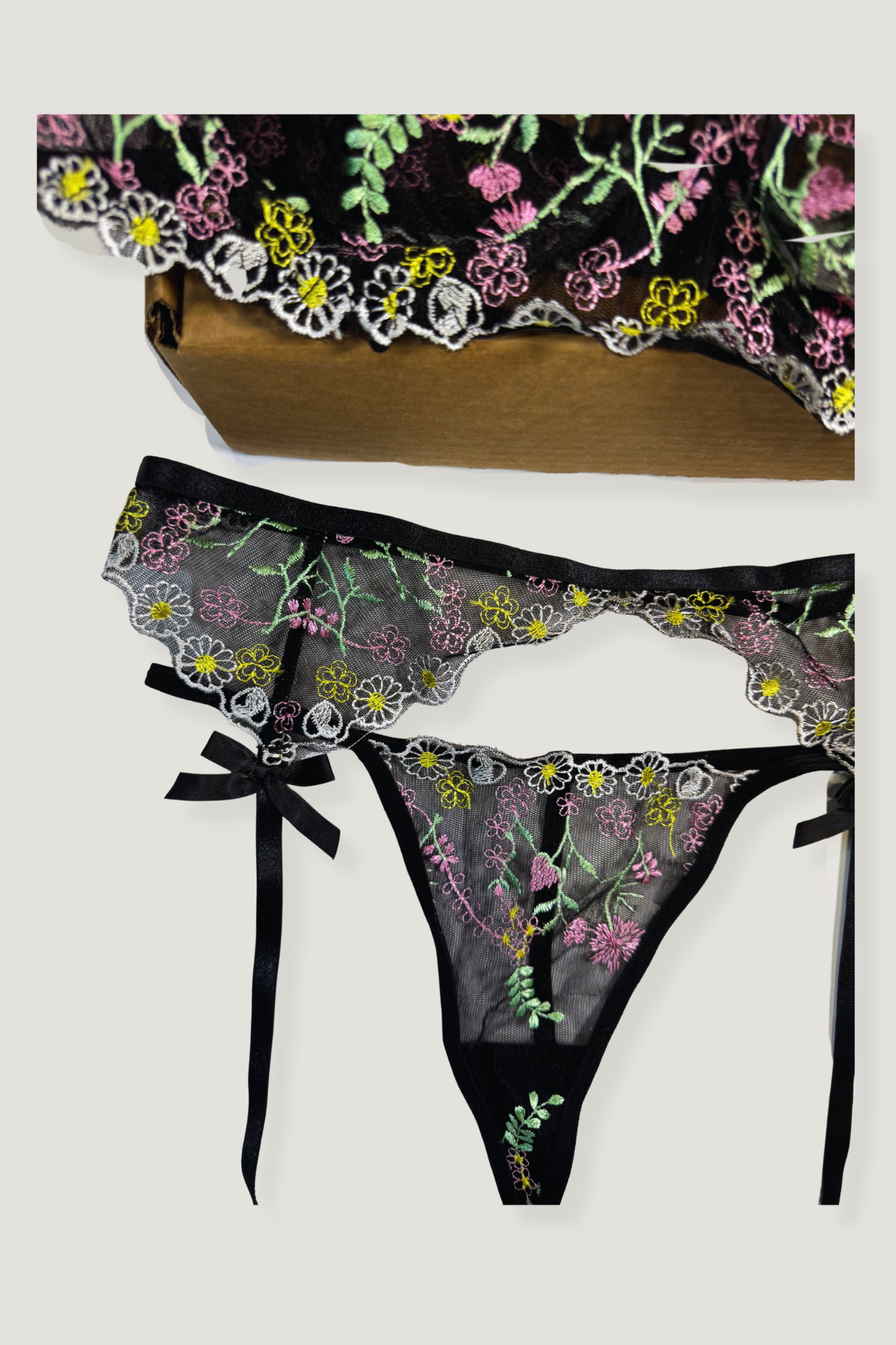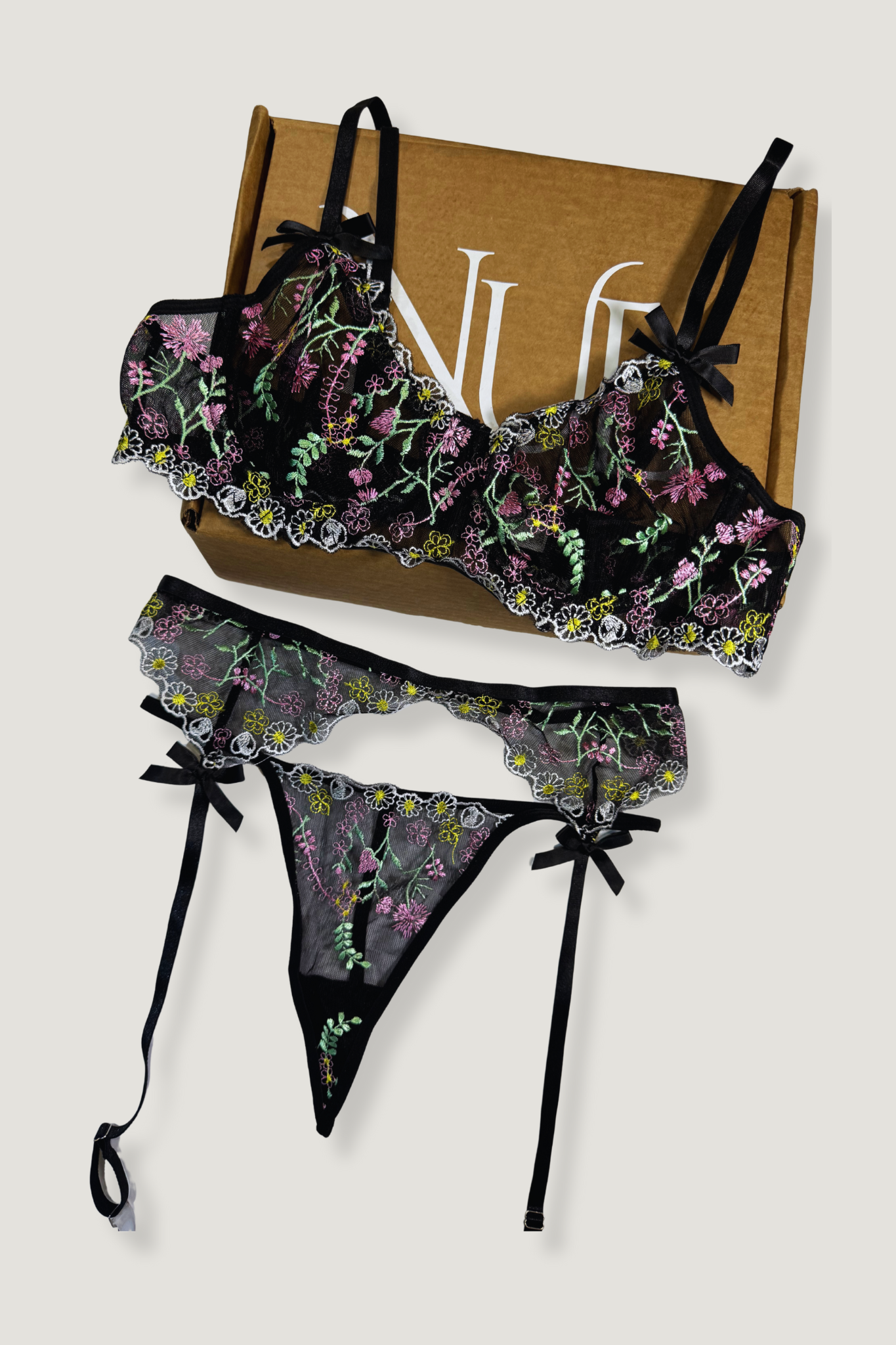 El “Carmín” combina la elegancia del negro con bordados florales en un set de tres piezas. Cada detalle ha sido pensado para realzar tus curvas y transmitir confianza y feminidad.