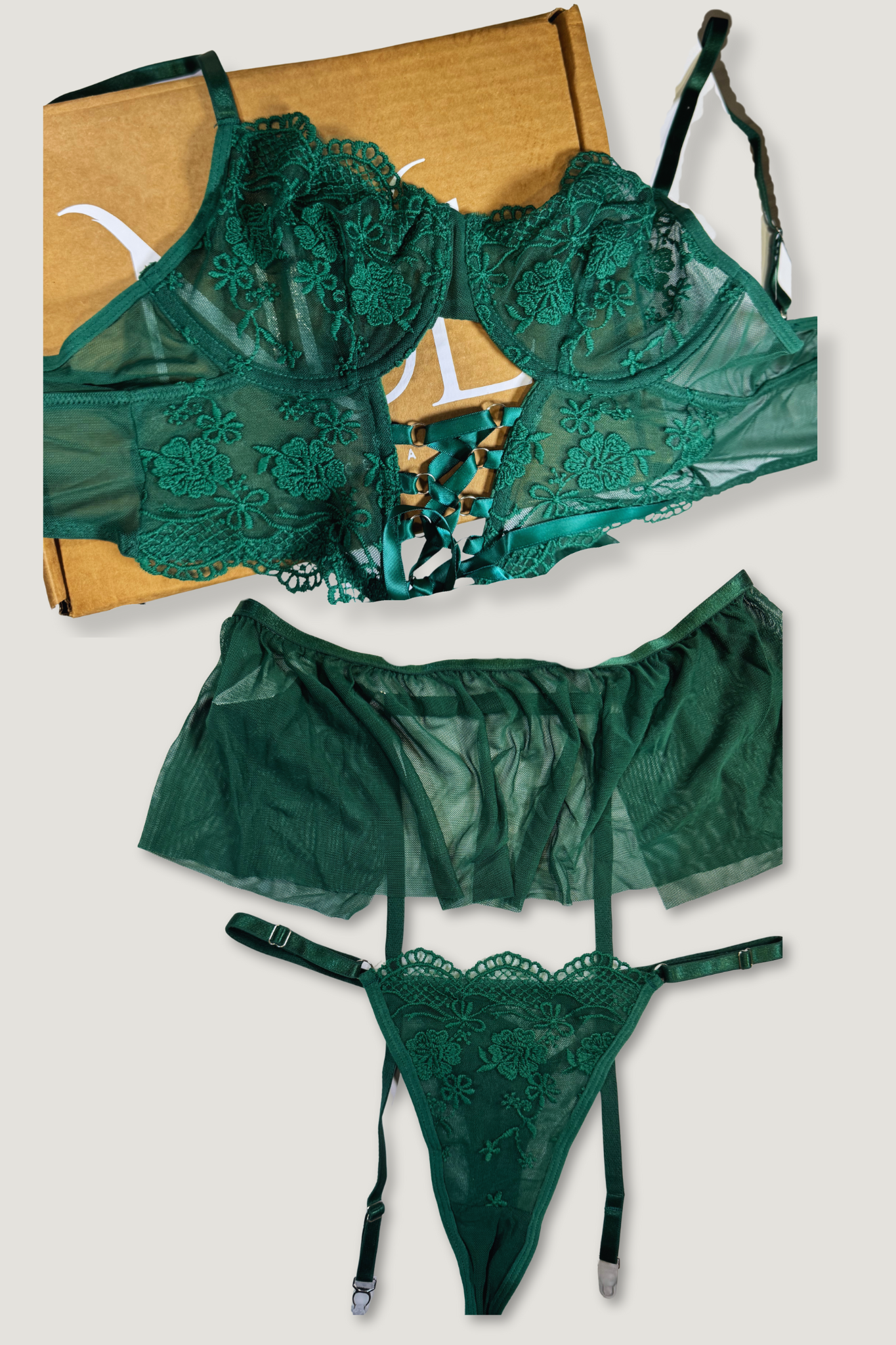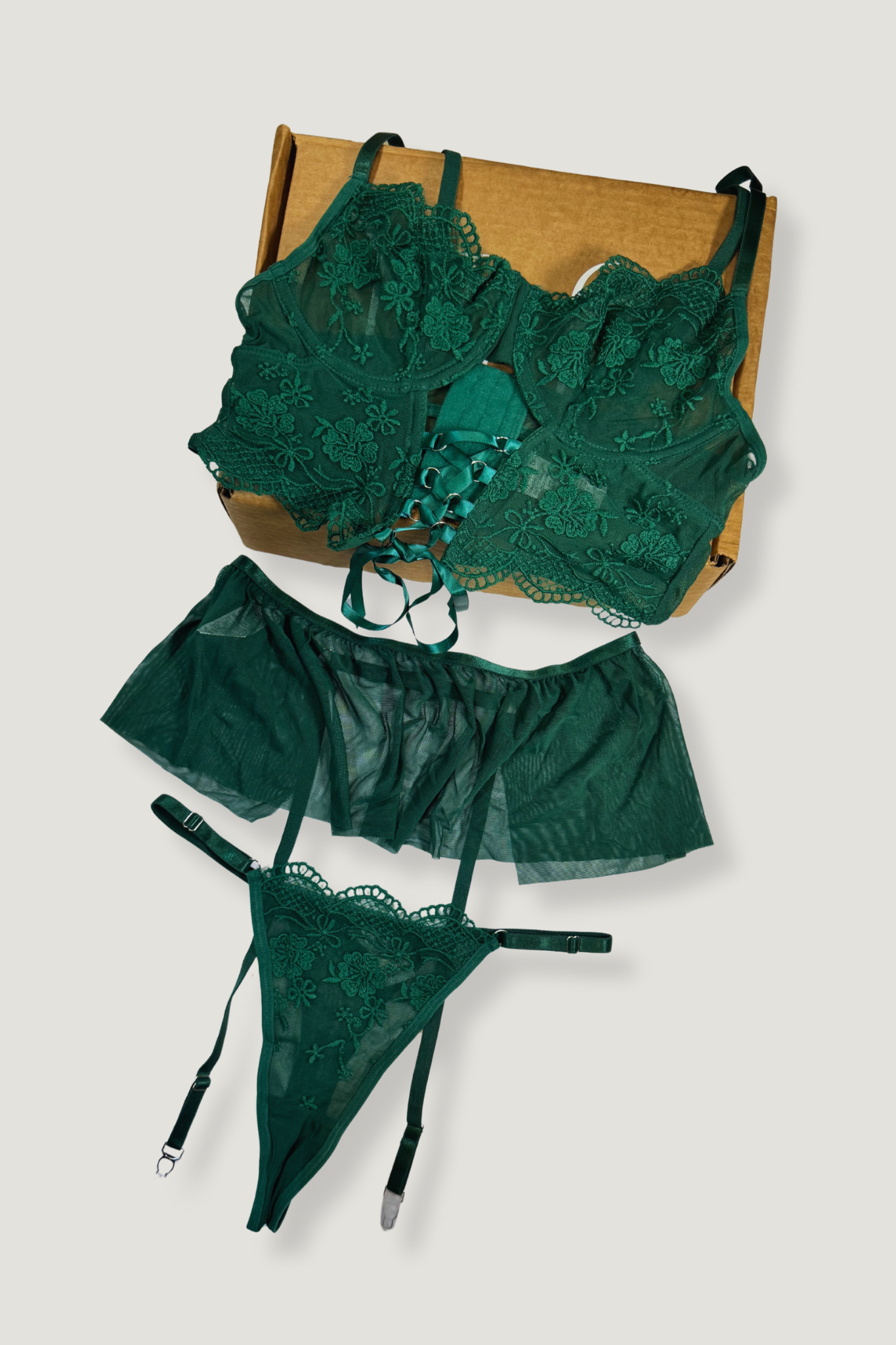 Descubre la elegancia del “Emeralda”, un conjunto de tres piezas en verde esmeralda que incluye sujetador, liguero y panty a juego. Su diseño delicado realza la figura femenina con sofisticación y estilo, ideal para momentos especiales.