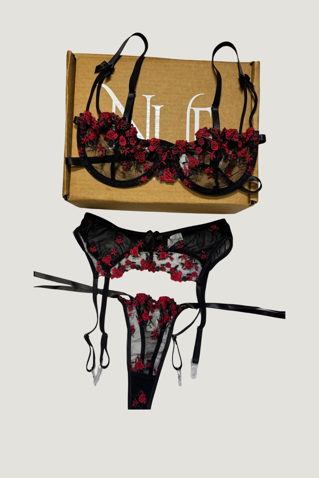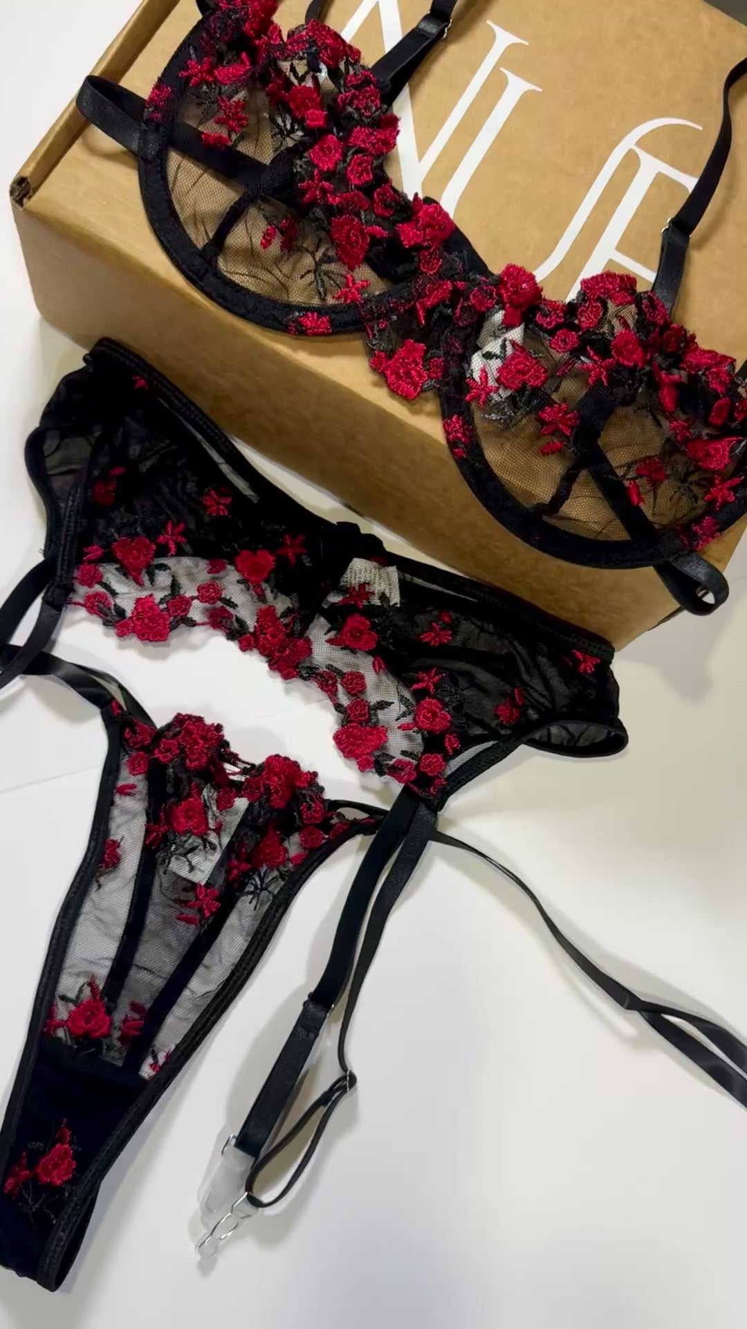 Set de 3 piezas en encahe floral negro con flores rojas. Diseño que mezcla elegancia y sensualidad, resaltando la silueta.
